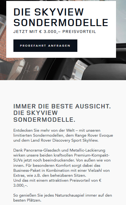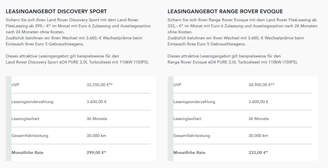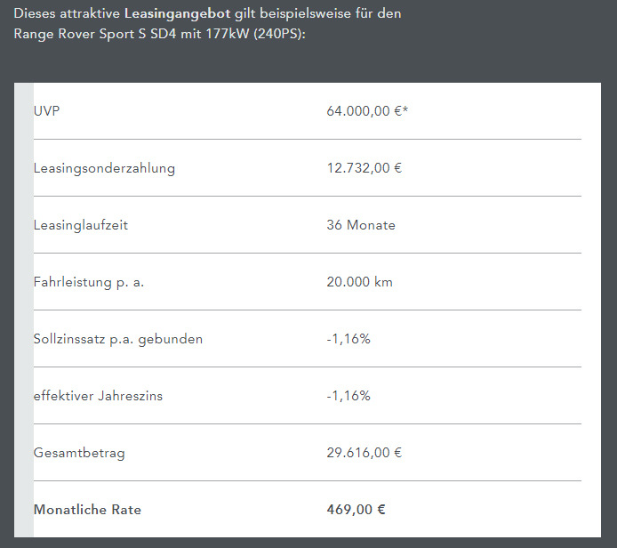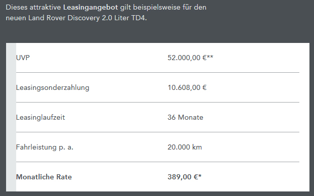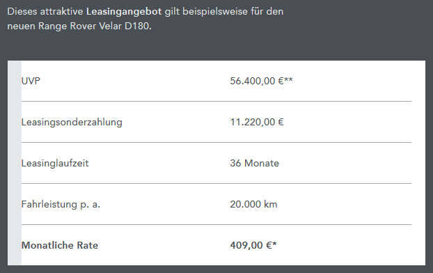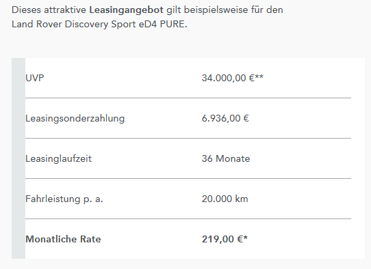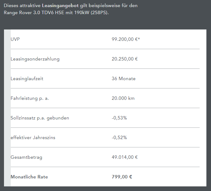 Sonderleasing, Sonderzahlung € 20.250,-, 36 Monatsraten à € 799,-, Laufleistung 60.000 km |