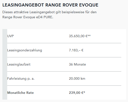 Sonderleasing, Sonderzahlung € 7.183,-, 36 Monatsraten à € 239,-, Laufleistung 60.000 km |