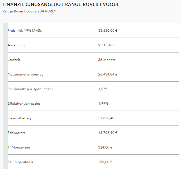 1,99 % Sonderfinanzierung, Anzahlung € 9.215,-, 1. Monatsrate € 324,-, 34 Monatsraten à € 259,-, Schlussrate € 18.706,- |