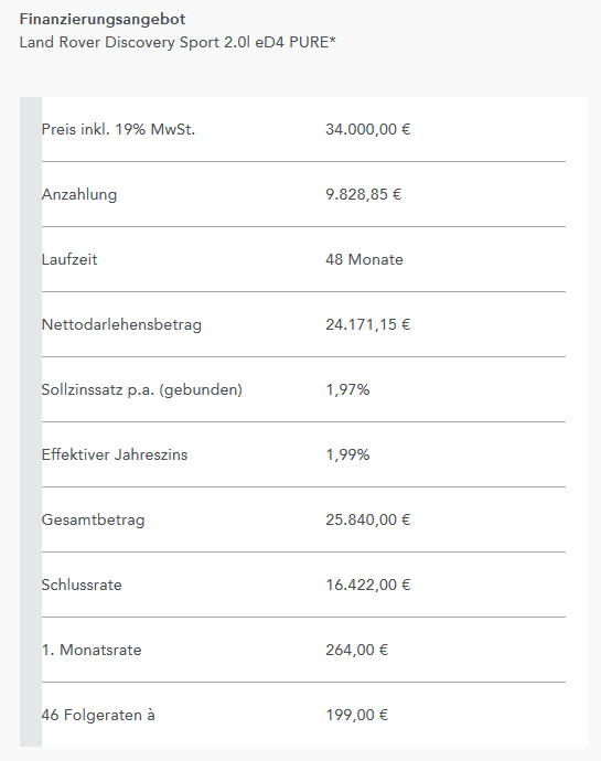 1,99 % Sonderfinanzierung, Anzahlung € 9.829,-, 1. Monatsrate € 264,-, 46 Monatsraten à € 199,-, Schlussrate € 16.422,- |