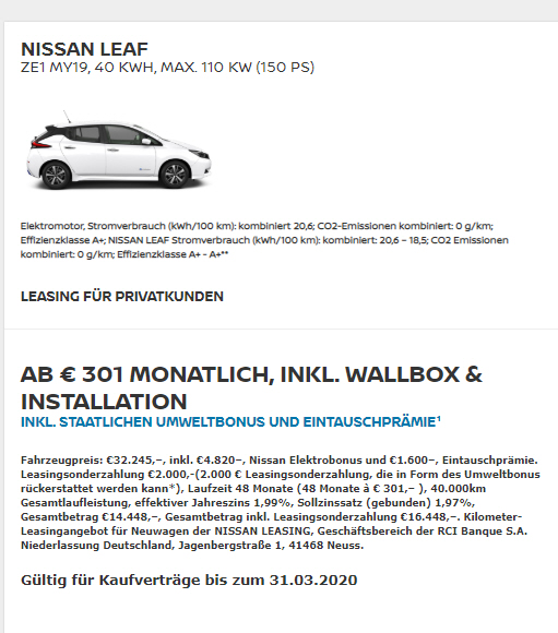 Staatliche Kaufprämie für Elektrofahrzeuge, Sonderleasing, Sonderzahlung € 7.480,-, 48 Monatsraten à € 349,-, Laufleistung 40.000 km |