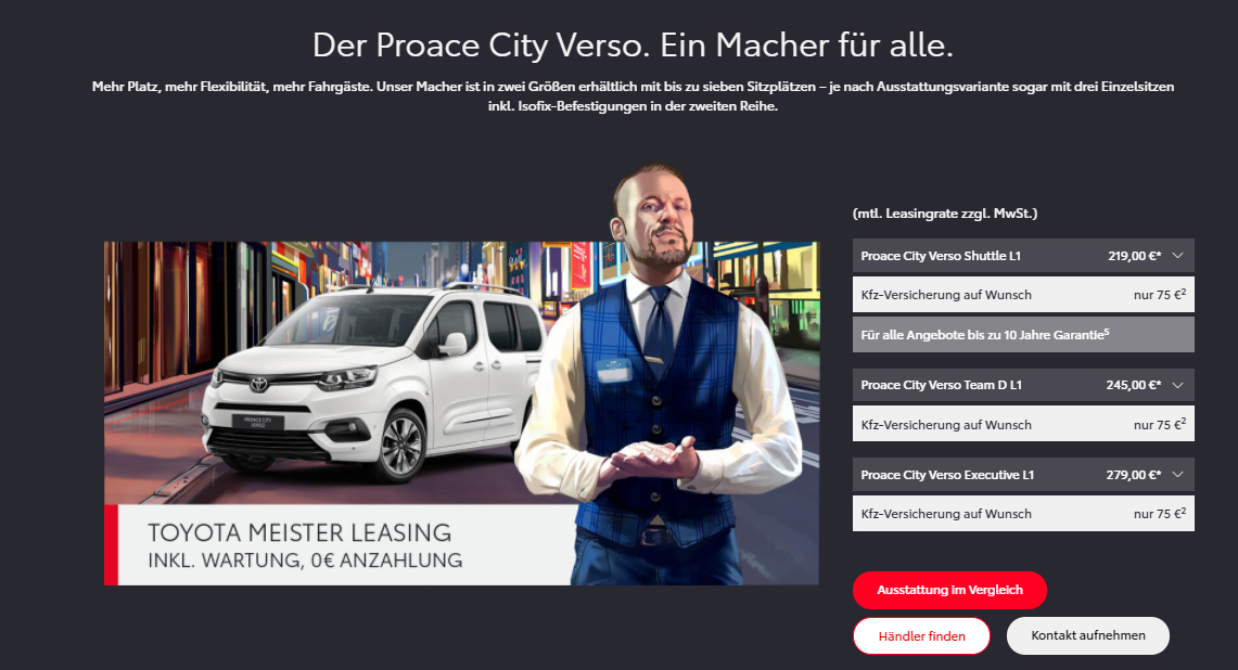 Sonderleasing für Gewerbetreibende, Wartung inkl., Versicherung optional für € 75,- / Monat |