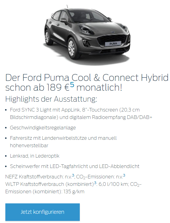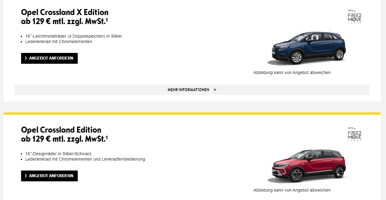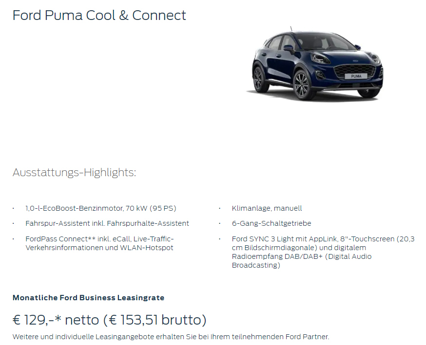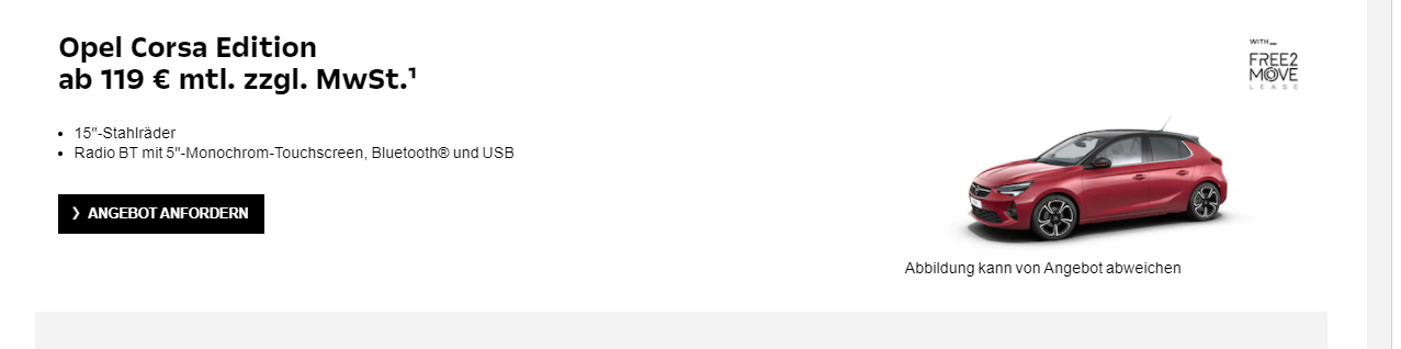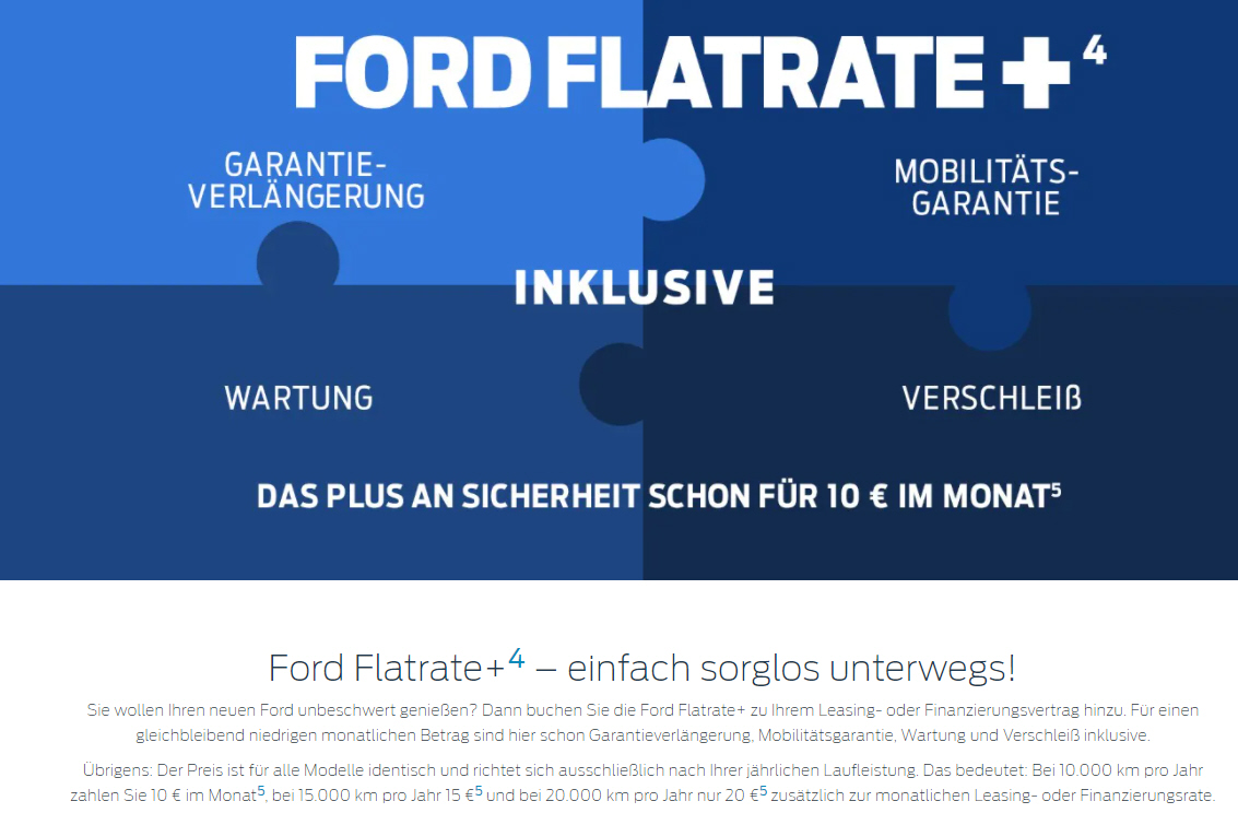 Flatrate+ (Garantieverlängerung, Mobilitätsgarantie, Wartung und Verschleiß) bei 15.000 km pro Jahr für € 15,- monatlich |