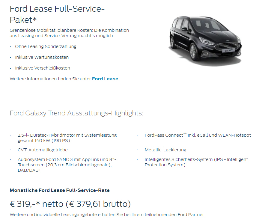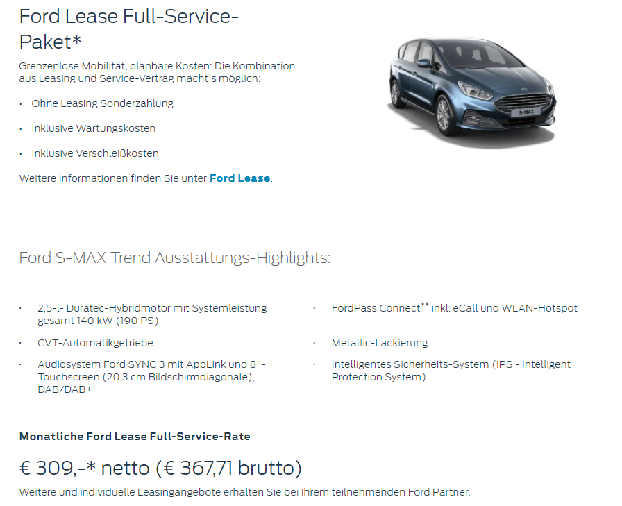 Flatrate+ (Garantieverlängerung, Mobilitätsgarantie, Wartung und Verschleiß) bei 20.000 km pro Jahr für € 20,- monatlich |