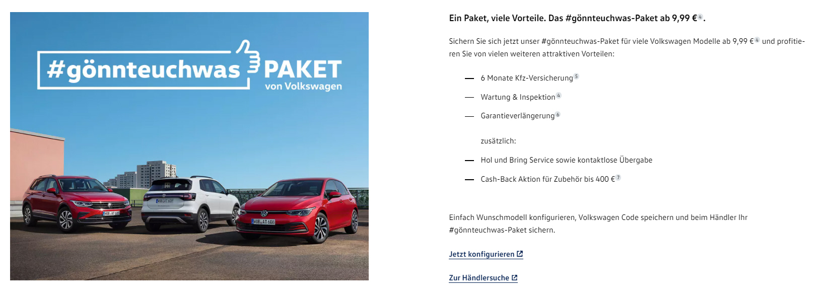 Garantie, 6 Monate KFZ-Versicherung, Wartung, Hol-und Bring-Service und € 400,- Cash-Back bei Kauf von Zubehör in 90 Tagen nach FZ-Kauf optional für € 9,99 im Monat |