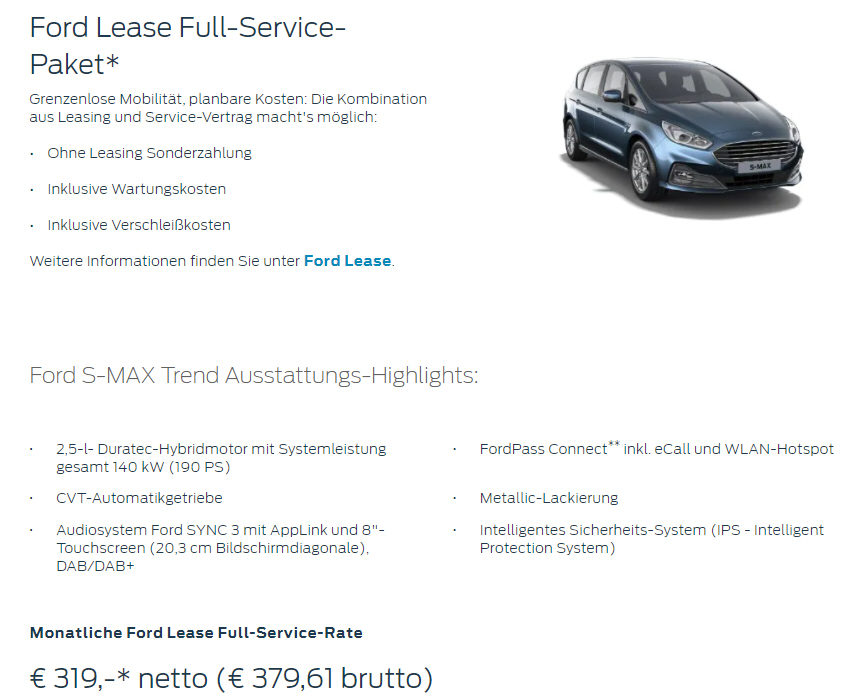 Flatrate+ (Garantieverlängerung, Mobilitätsgarantie, Wartung und Verschleiß) bei 20.000 km pro Jahr für € 20,- monatlich |