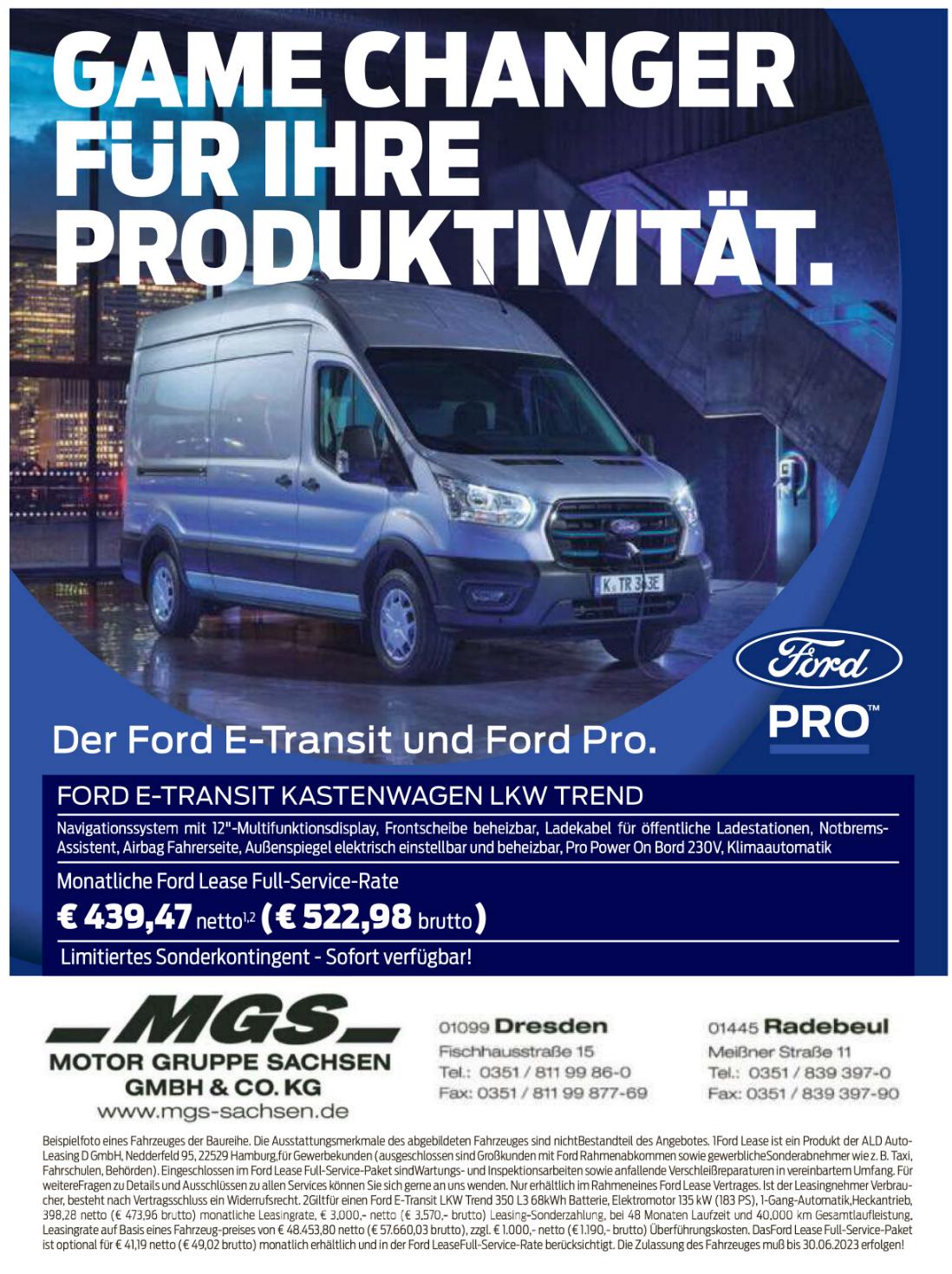 Ford Händler bewerben Leasingangebote für den E-Transit. Der visuelle Restwert (UPE minus Anzahlung minus Summe der Raten in % der UPE) liegt nach vier Jahren Laufzeit über 60 %.