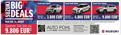 | Suzuki Händler setzen die nationale Aktion der „Big Deals“ fort, bei der modellabhängige Vorteile von bis zu € 7.000,- gewährt werden. |