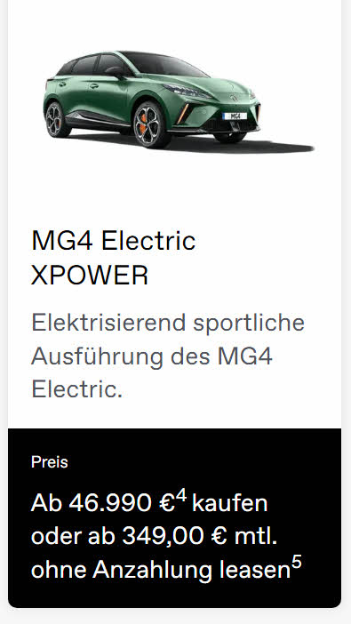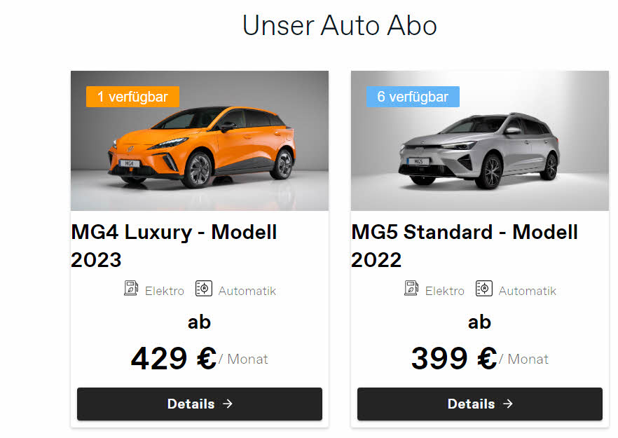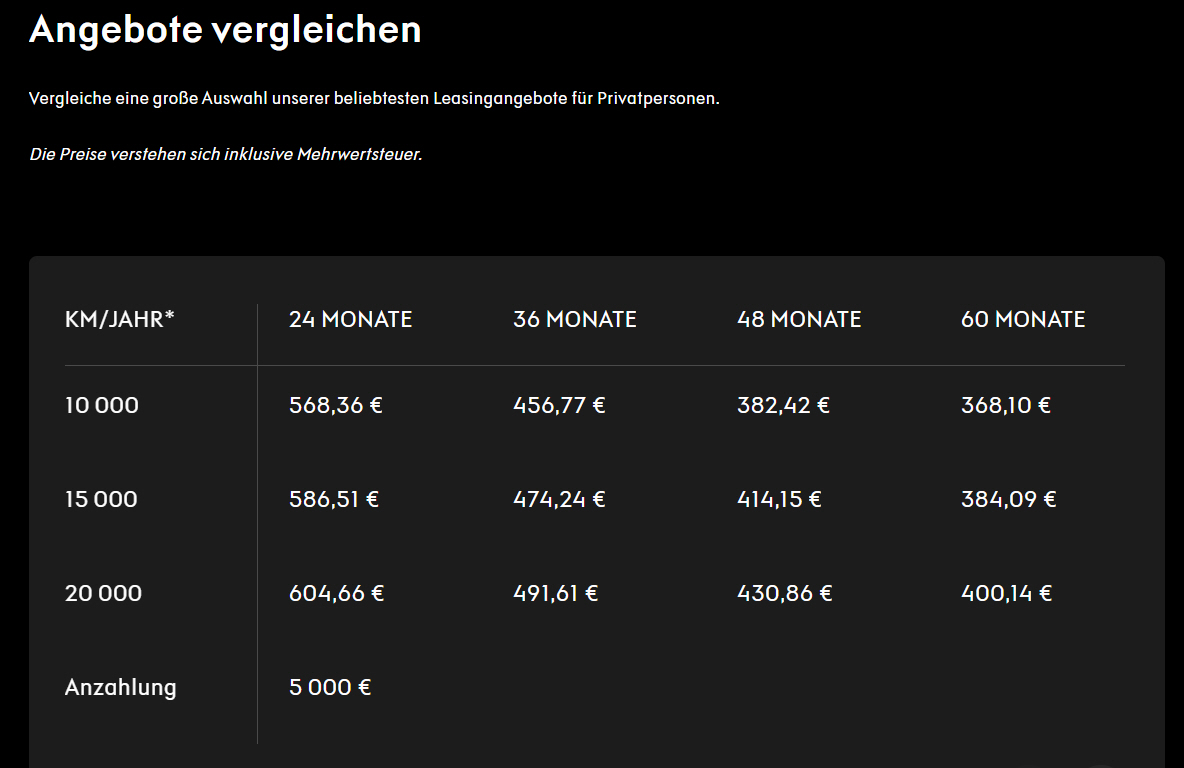Abo (Miete), inkl. Wartung, Versicherung und Steuer, € 0,20 pro zusätzlichem Kilometer, jederzeit kündbar |