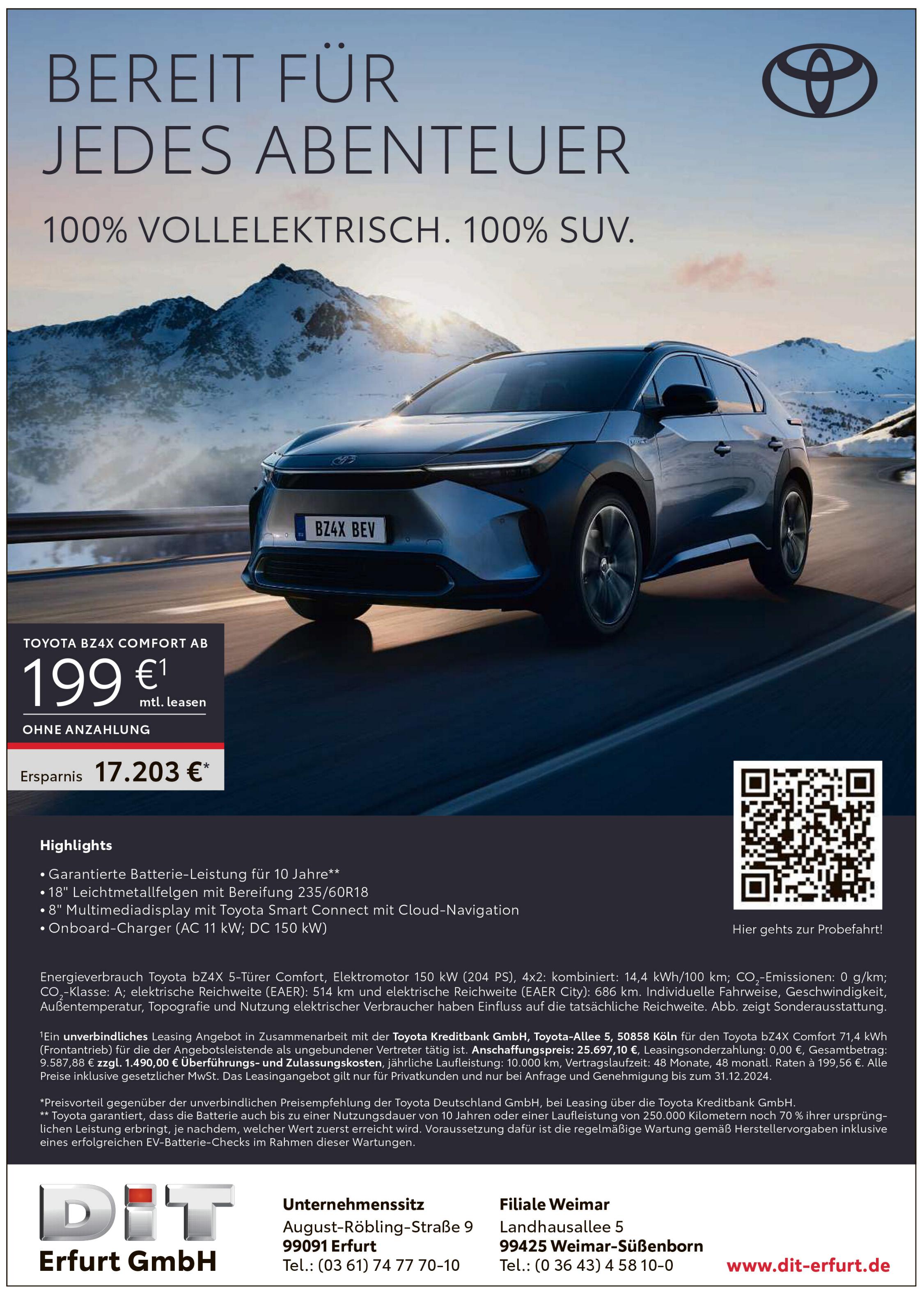 | Toyota Händler machen gute Leasingangebote ohne Sonderzahlung mit 48 Monaten Laufzeit für den vollelektrischen bZ4X. Der durchschnittliche visuelle Restwert (UPE minus Summe der Zahlungen in % der UPE) beträgt 71 %. |