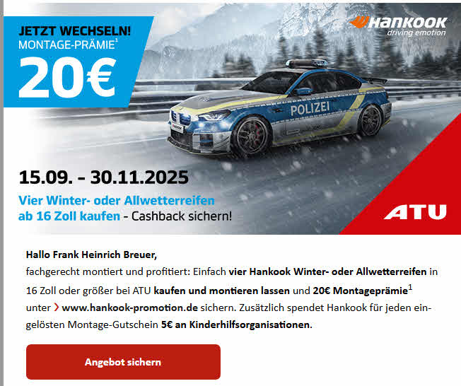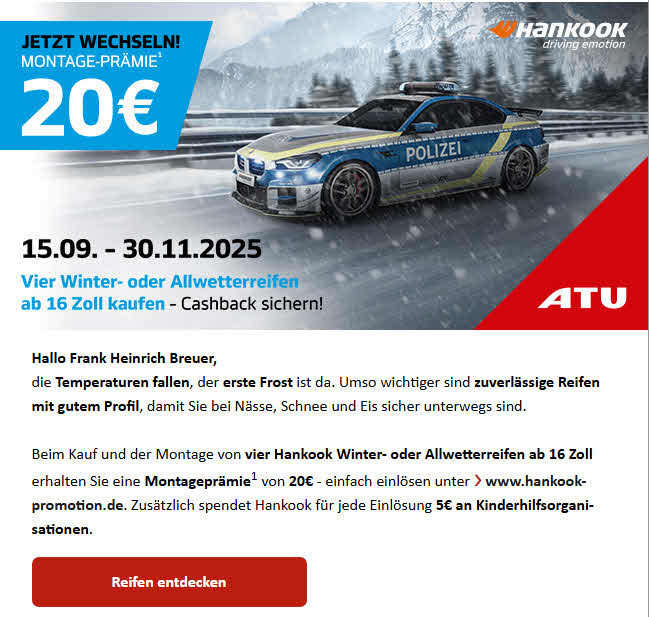 € 20,- Cashback bei Kauf von Hankook Winter- oder Allwetterreifen ab 16 Zoll |